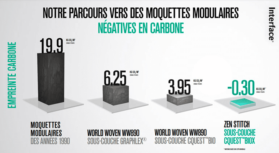 Interface a lancé en 2021 une dalle de moquette à empreinte carbone négative, c’est à dire que les matériaux contenus dans la dalle absorbent plus de carbone qu’ils en émettent, de la phase d’extraction jusqu’à la sortie de l’usine.